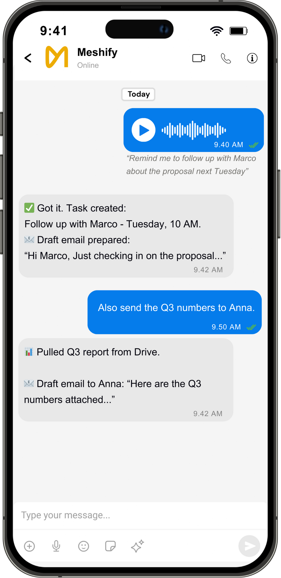 Dump your brain as-is. Meshify turns them into clear next actions so nothing slips through the cracks.